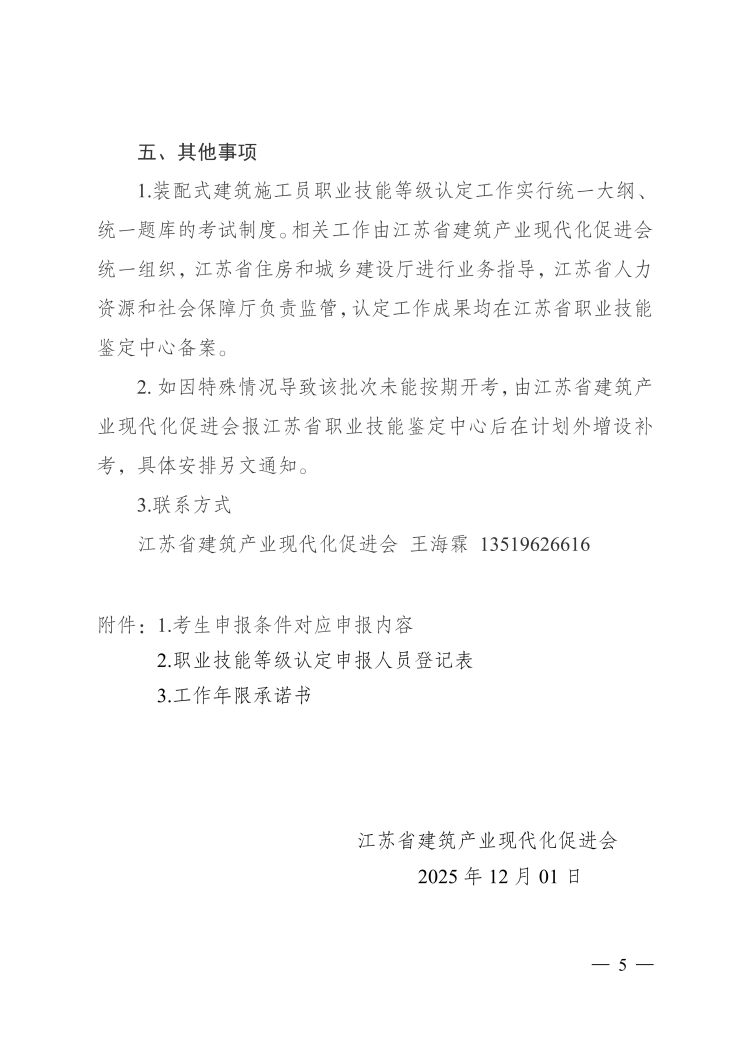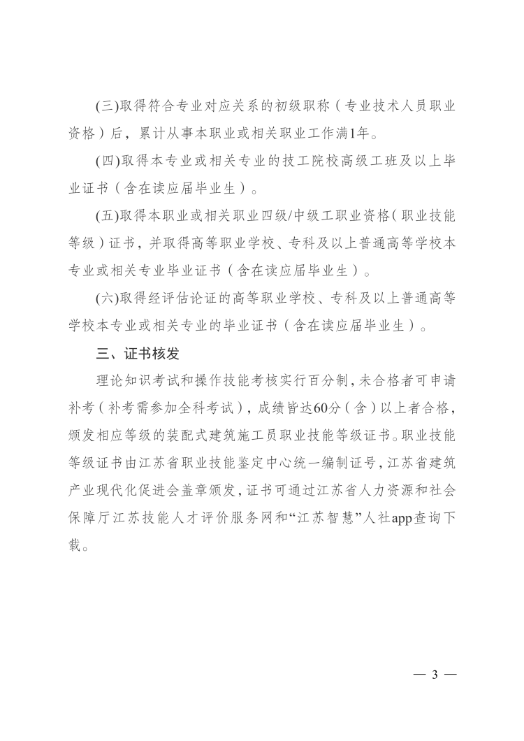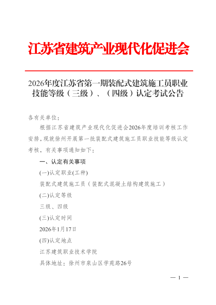 2026年度江苏省第一期装配式建筑施工员职业 技能等级(三级、四级)认定考试公告