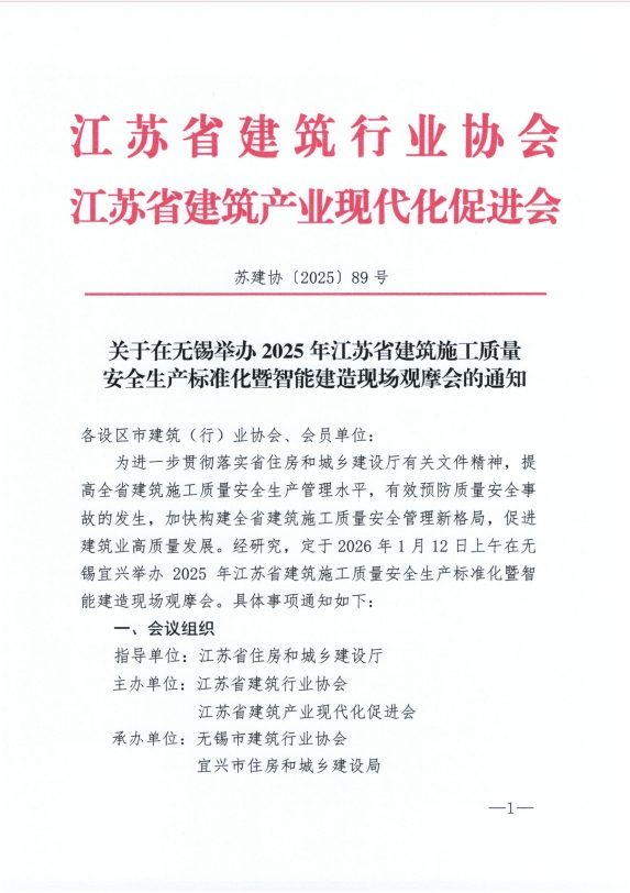 关于在无锡举办2025年江苏省建筑施工质量安全生产标准化暨智能建造现场观摩会的通知