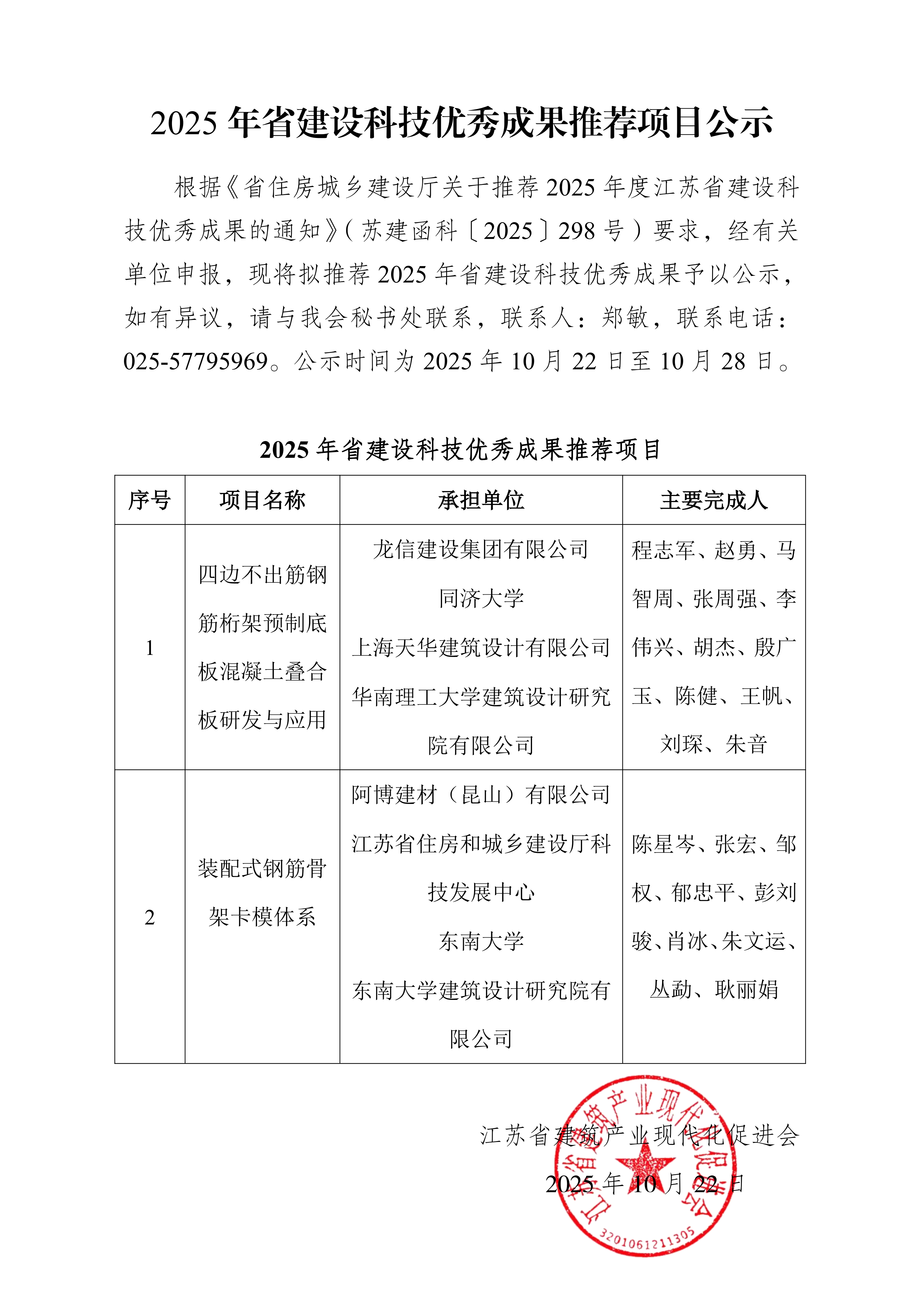 2025 年省建设科技优秀成果推荐项目公示